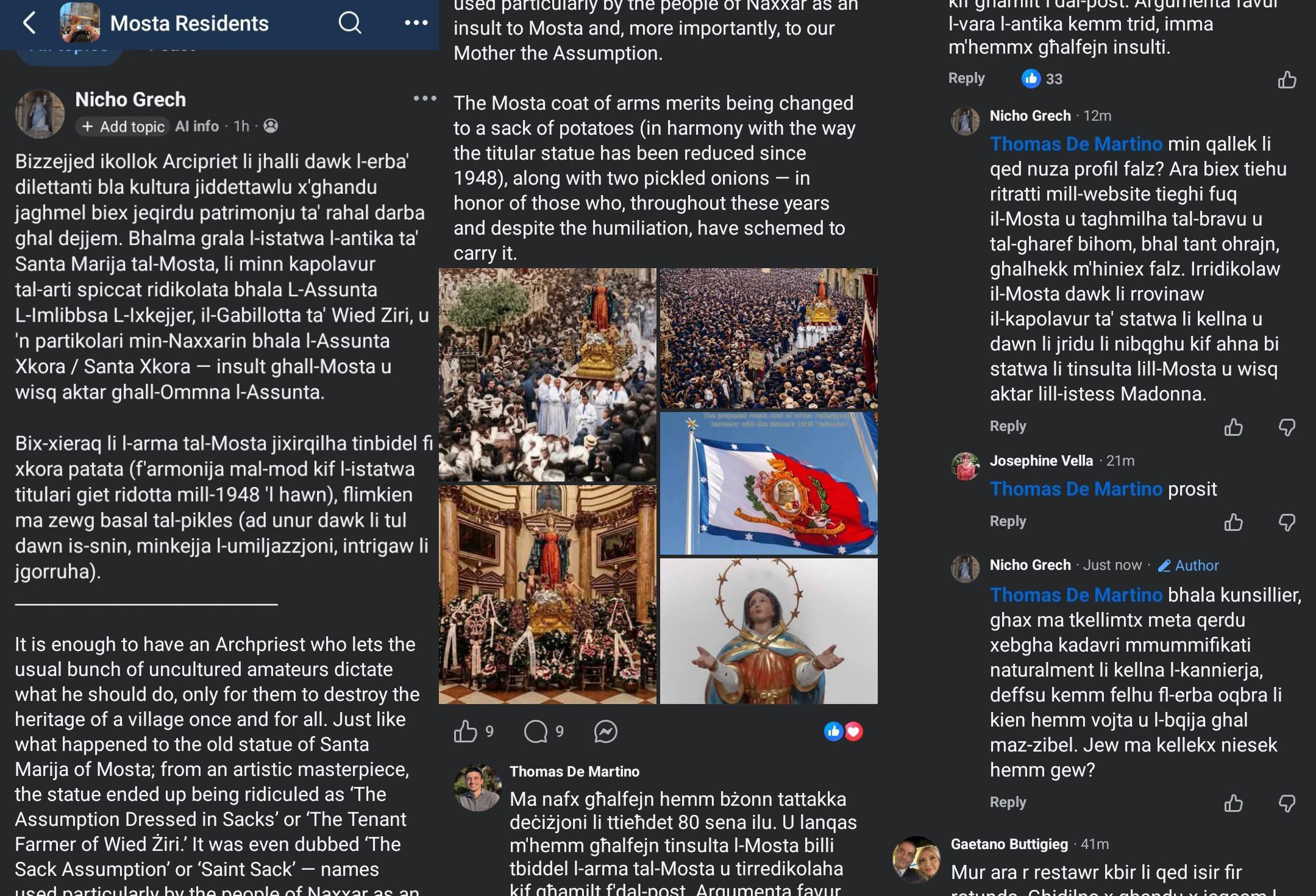 - Ghal ricerka milli ghamilt fuq il-Knisja l-Qadima tal-Mosta (link1, link2), fuq Laqmijiet li kellna mal-mitt sena ilu (link), fuq In-nicec u l-istatwi fit-toroq tal-Mosta (link1, link2) u fuq Il-250 sena mill-Konsagrazzjoni tal-Knisja l-Qadima (link). Abbandunat ghal rihi u bl-abbuzi ma jaqtghu xejn tal-Psikjatrija (1,